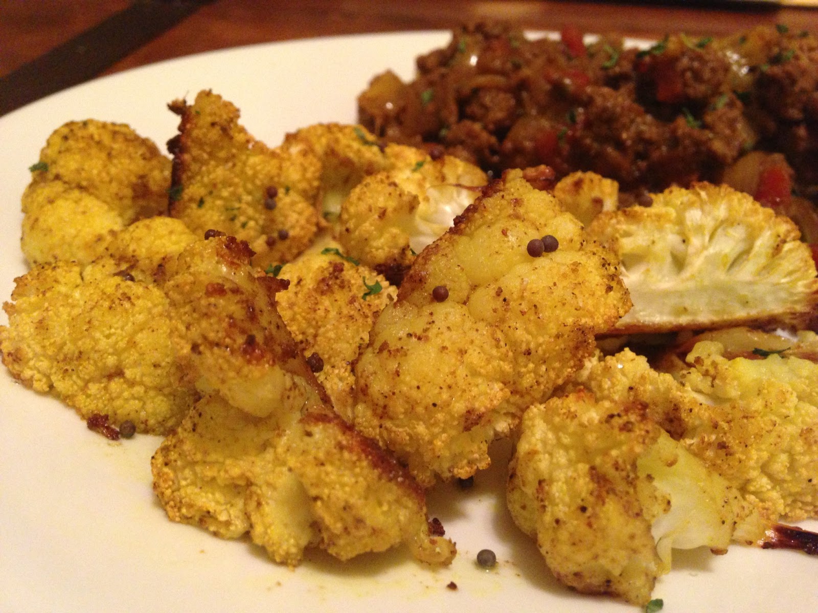 Preheat the oven to 400. Line a baking sheet with foil. Mix spices into the oil, put cauliflower in a bowl, then drizzle evenly over the cauliflower. Stir thoroughly (if the cauliflower is cold, the oil will solidify again, so be quick about the first few stirs!). Toss the cauliflower onto the baking sheet and bake for 25-35 minutes.
